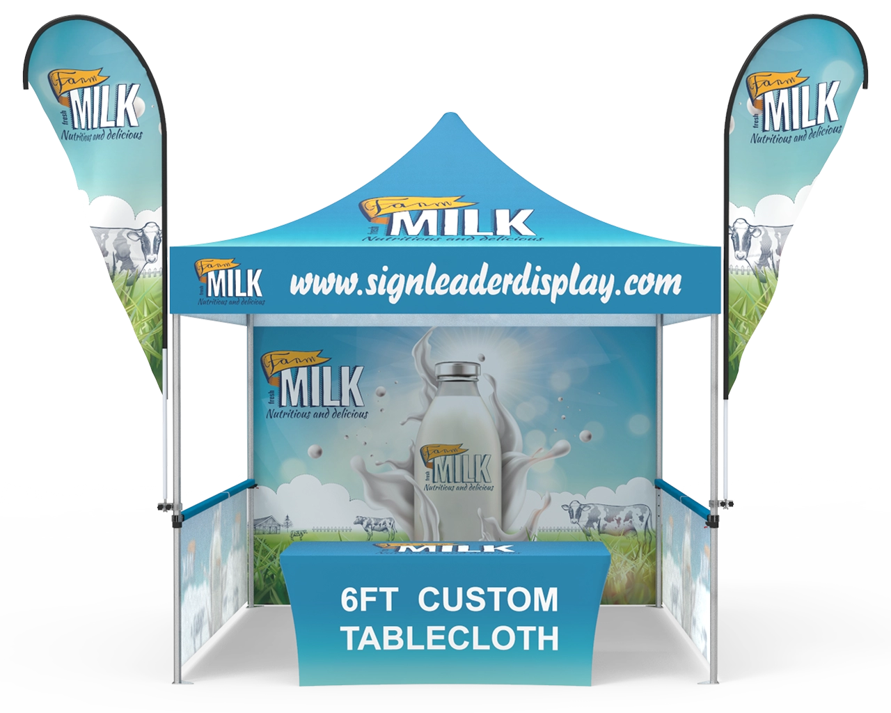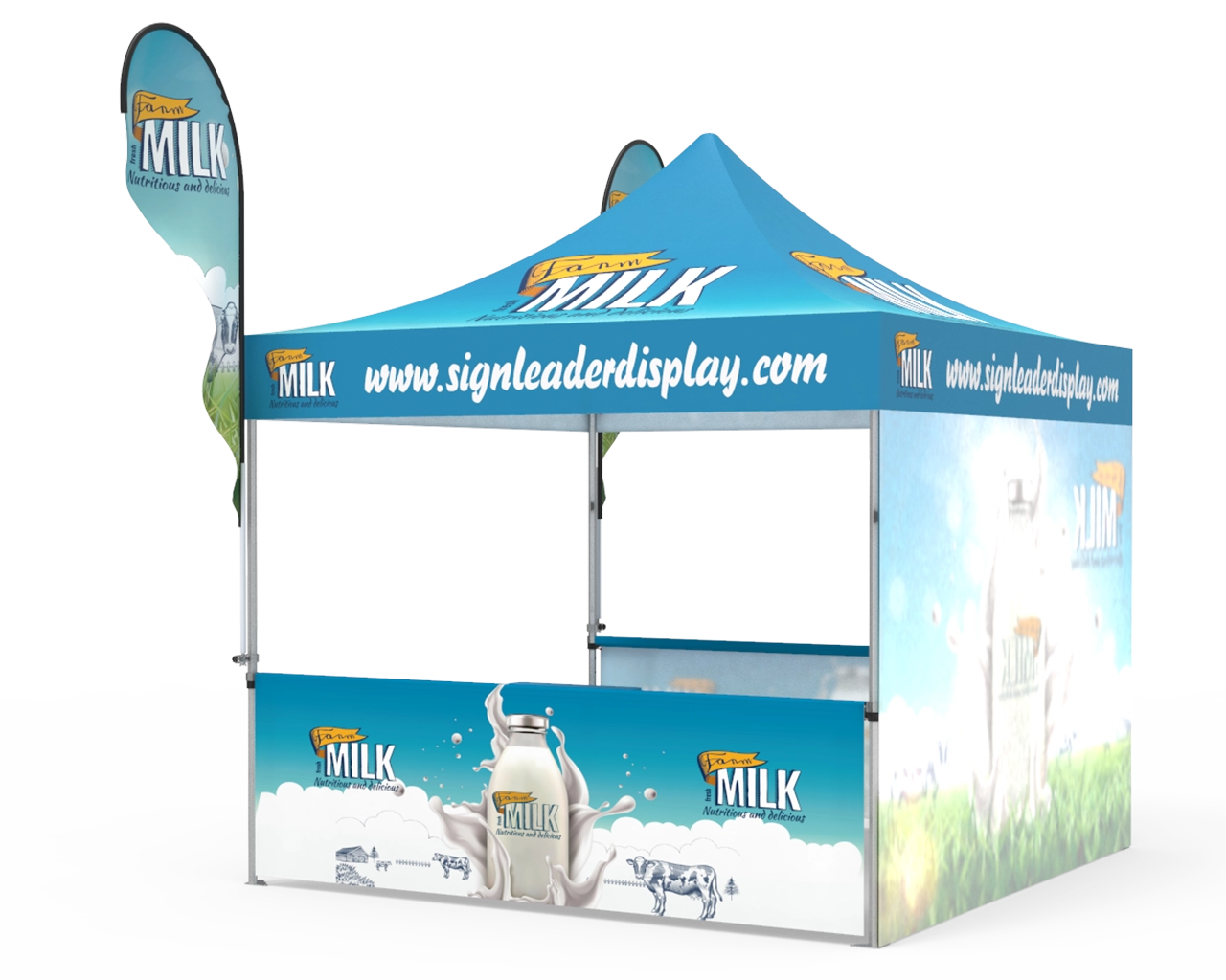This custom 10 x 10 pop up canopy tent combos 12 is equipped with a 10x10ft durable 1.6 inch (40 mm) heavy-duty aluminum frame, and 600D Oxford cloth thermal transfer custom printed graphics for the canopy and 1pc customize print full-backwall, 2pc half-sidewall with nice graphic printing, 2pc 7ft single-sided teardrop flying banners, and 1pc 6ft stretch fit open back table cover. Fast turnaround, free shipping, order now! Checkout with coupon code: TENT001 to get 10% off.