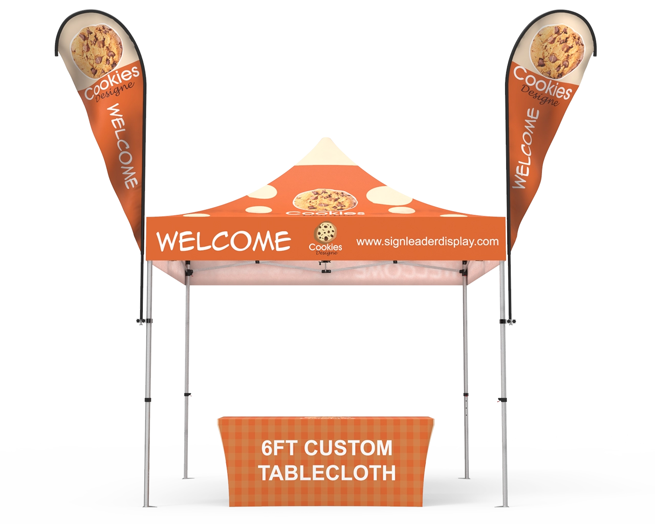 This custom 10 x 10 pop up canopy tent combos 13 is equipped with a 10x10ft durable 1.6 inch (40 mm) heavy-duty aluminum frame, and 600D Oxford cloth thermal transfer custom printed graphics for the canopy & 2pc 7ft single-sided teardrop flying banners, and 1pc 6ft stretch fit open back table cover. Fast turnaround, free shipping, order now! Checkout with coupon code: TENT001 to get 10% off.