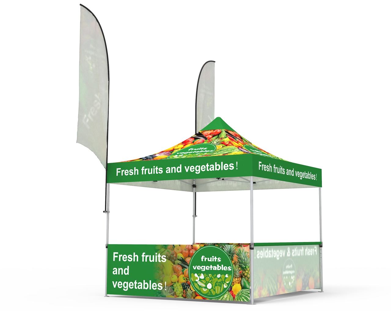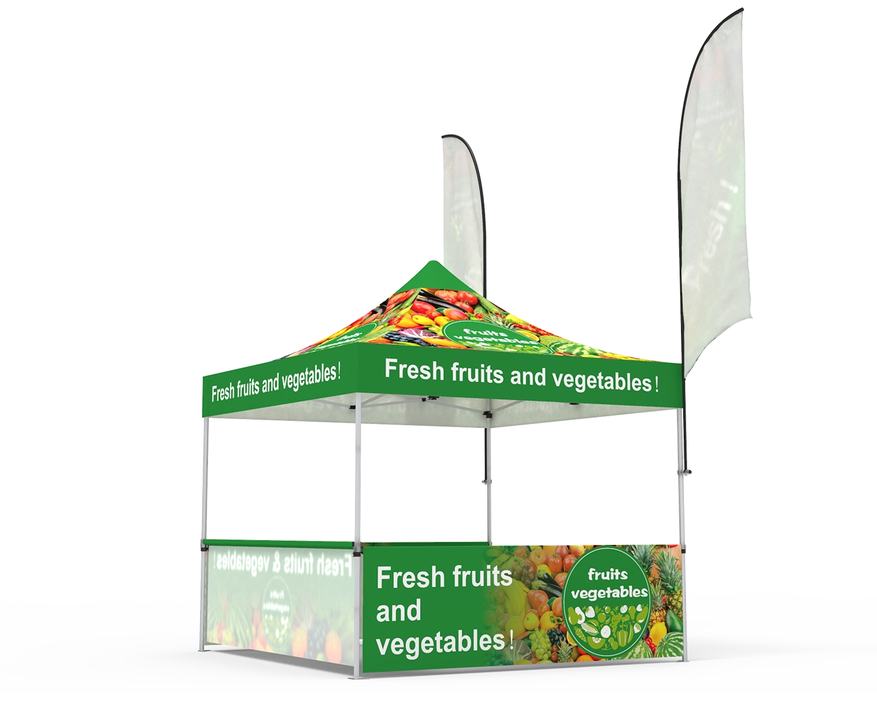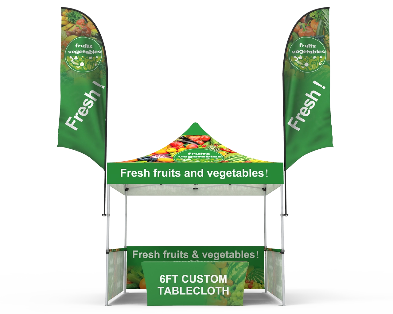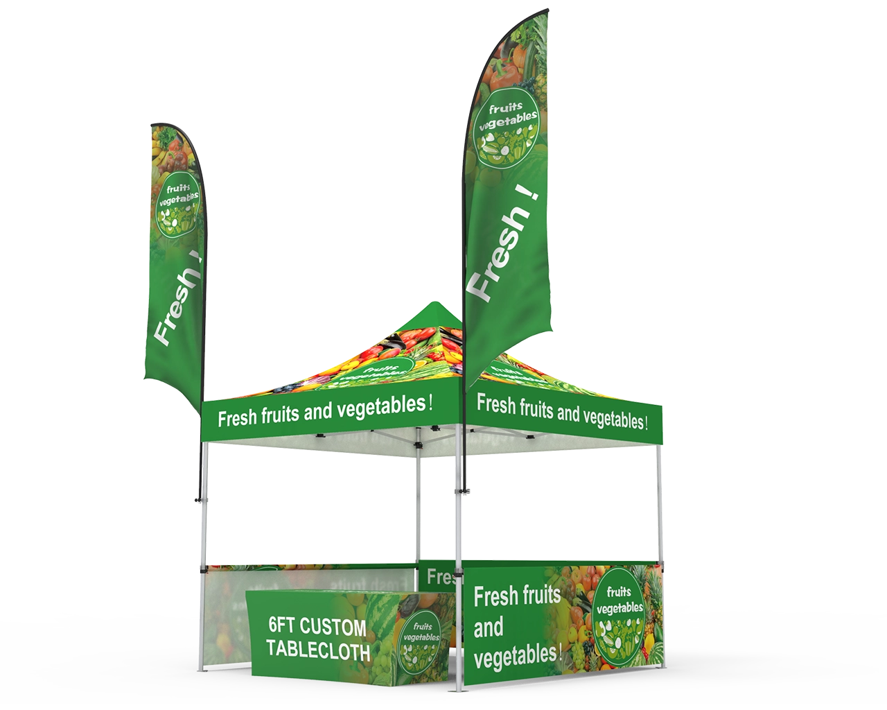 This custom 10 x 10 pop up canopy tent combos 14 is equipped with a 10x10ft durable 1.6 inch (40 mm) heavy-duty aluminum frame, and 600D Oxford cloth thermal transfer custom printed graphics for the canopy and 3pc custom printed half-sidewalls & 2pc 10ft single-sided custom flags, and 1pc 6ft stretch fit open back table cover. Fast turnaround, free shipping, order now! Checkout with coupon code: TENT001 to get 10% off.