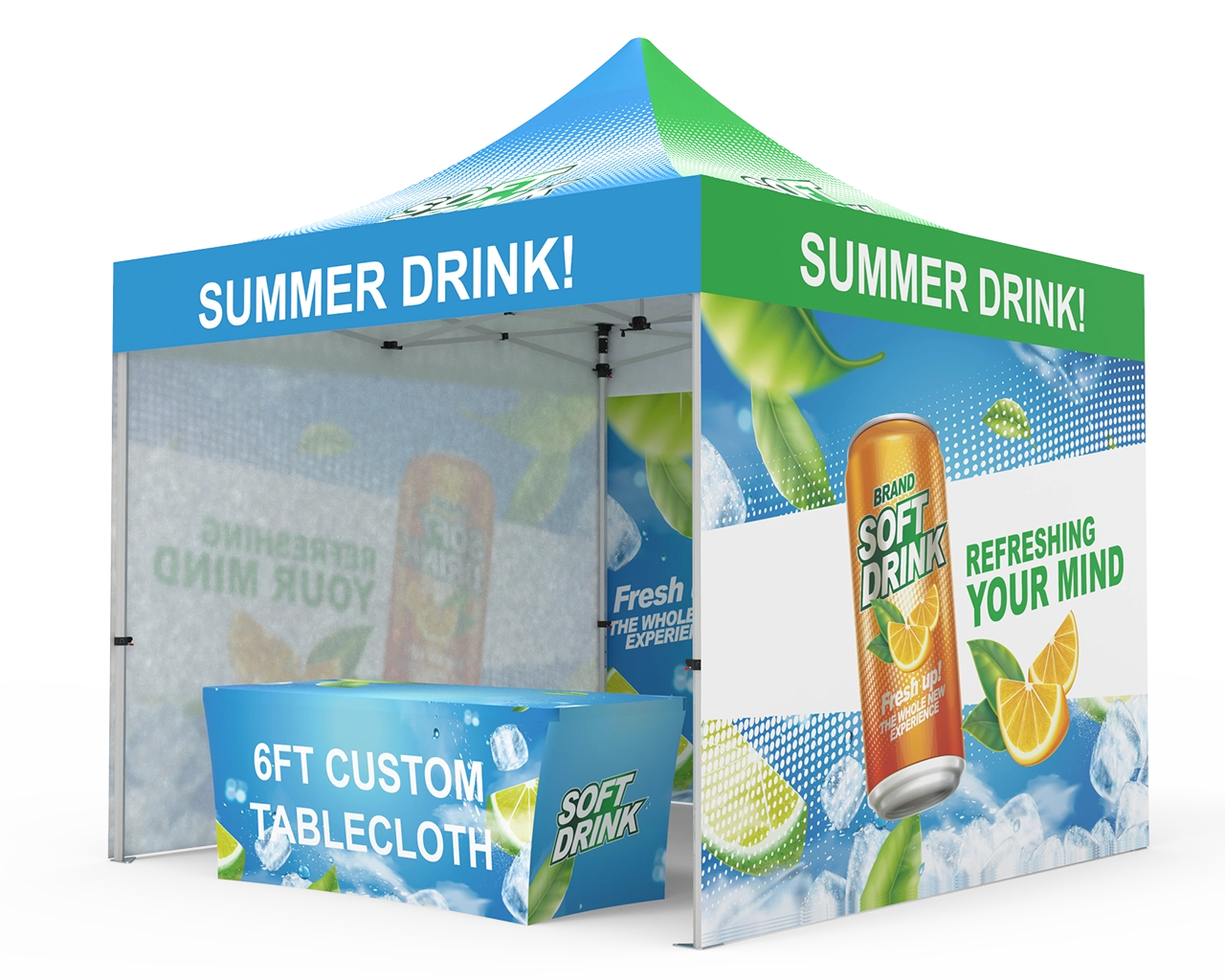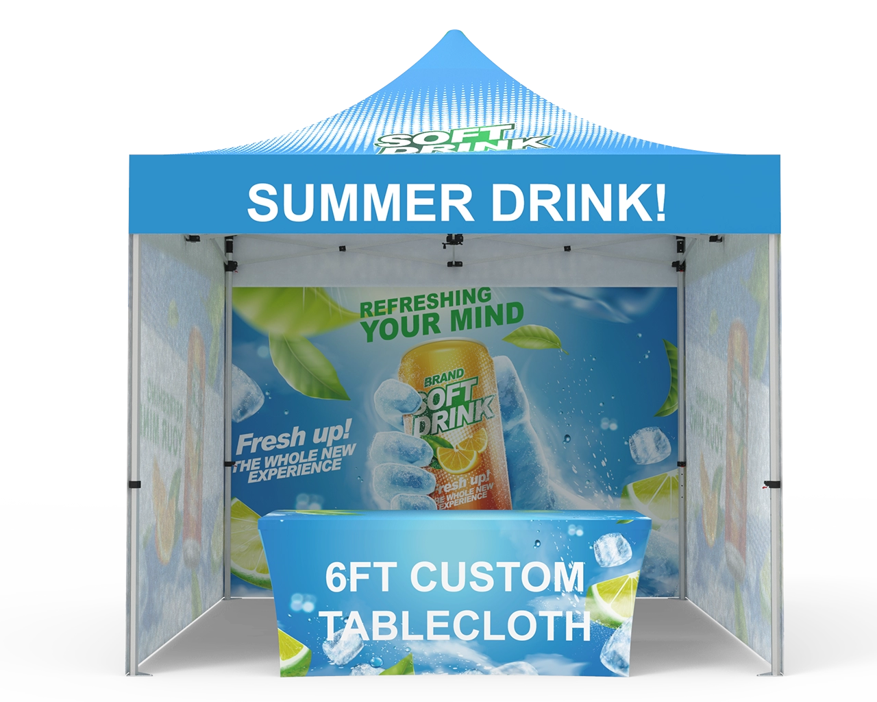 This custom 10 x 10 pop up canopy tent combos 16 is equipped with a 10x10ft durable 1.6 inch (40 mm) heavy-duty aluminum frame, and 600D Oxford cloth thermal transfer custom printed graphics for the canopy and 3pc custom printed Full backwalls, and 1pc 6ft stretch fit open back table cover. Fast turnaround, free shipping, order now! Checkout with coupon code: TENT001 to get 10% off.