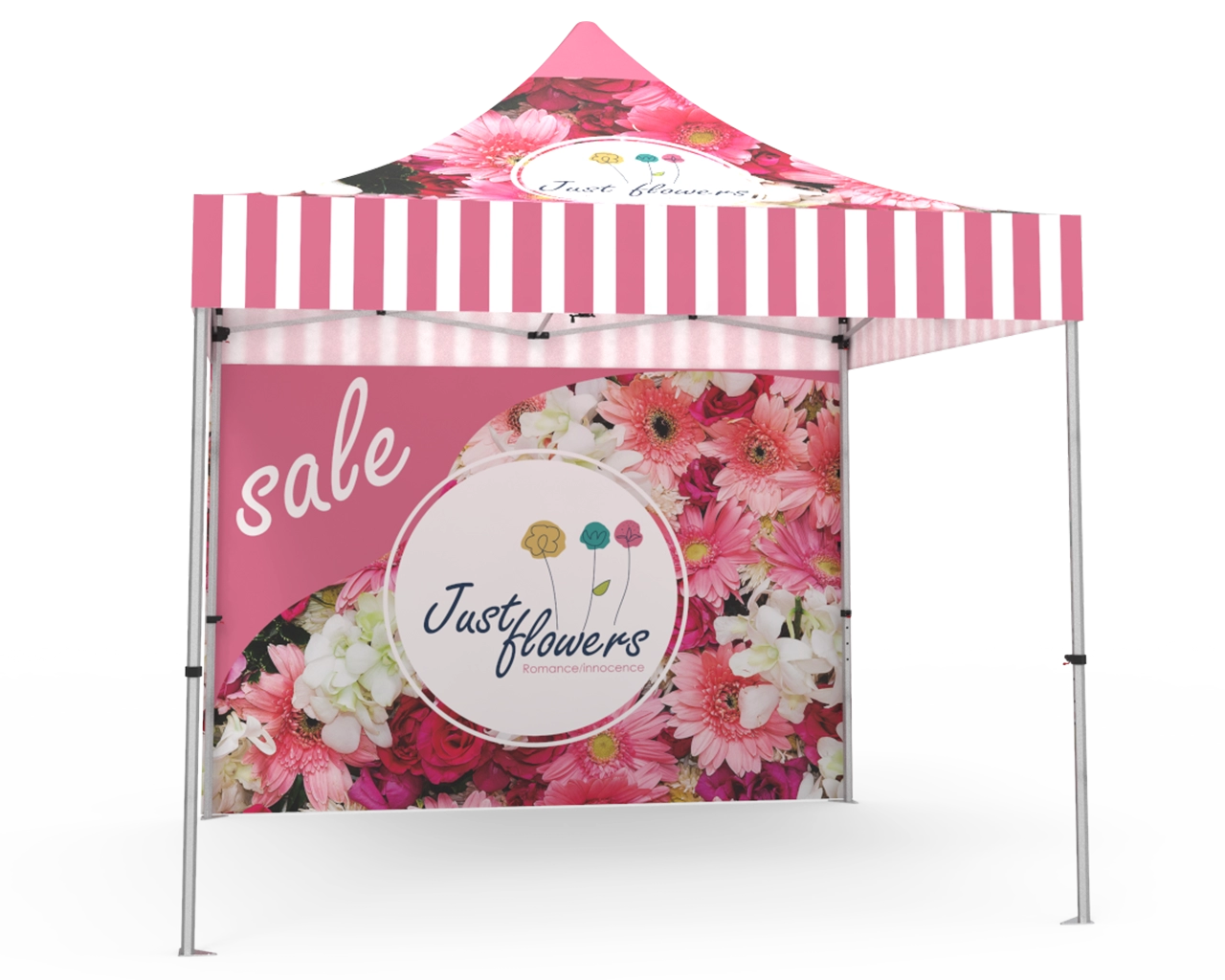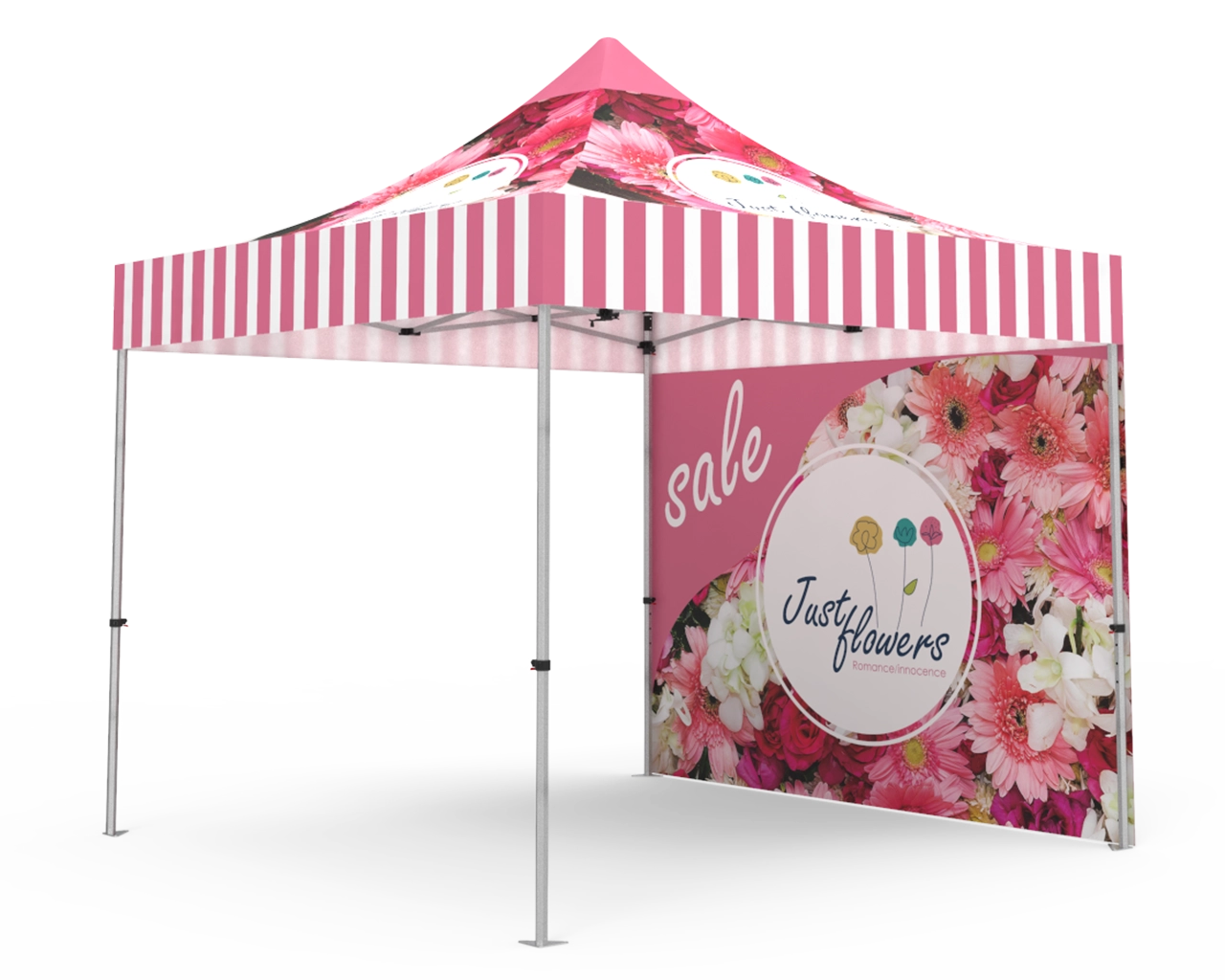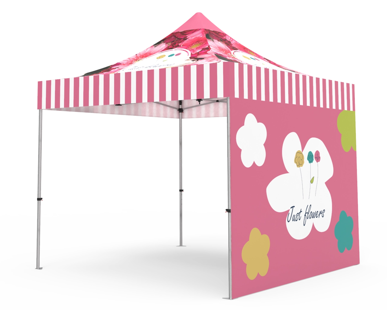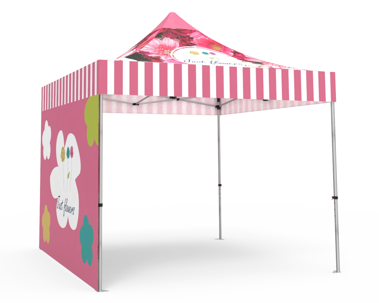 This 10x10 pop up canopy tent kit is equipped with a 10x10 ft durable 1.6 inch (40 mm) heavy-duty aluminum frame, and 600D Oxford cloth thermal transfer custom printed graphics for the canopy and double-sided full backwall. The pop up event tent can also resist rain, wind and other things that may ruin a good time. Fast turnaround, free shipping, order now! Checkout with coupon code: TENT001 to get 10% off.