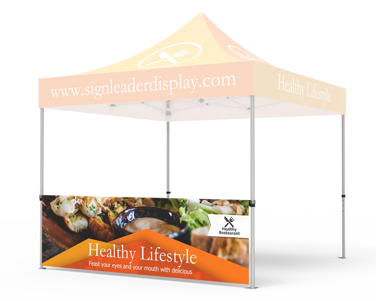 Increase brand attention to your enterprise at outside activities, sporting events, fairs and festivals. Signleader Display's 10x10 custom printed tent half walls make use of full digital printing which allows your event tent to be a 100% customizable with multi-coloration imprint. Promote and appeal to new customers with our commercial grade custom canopy tent for events.