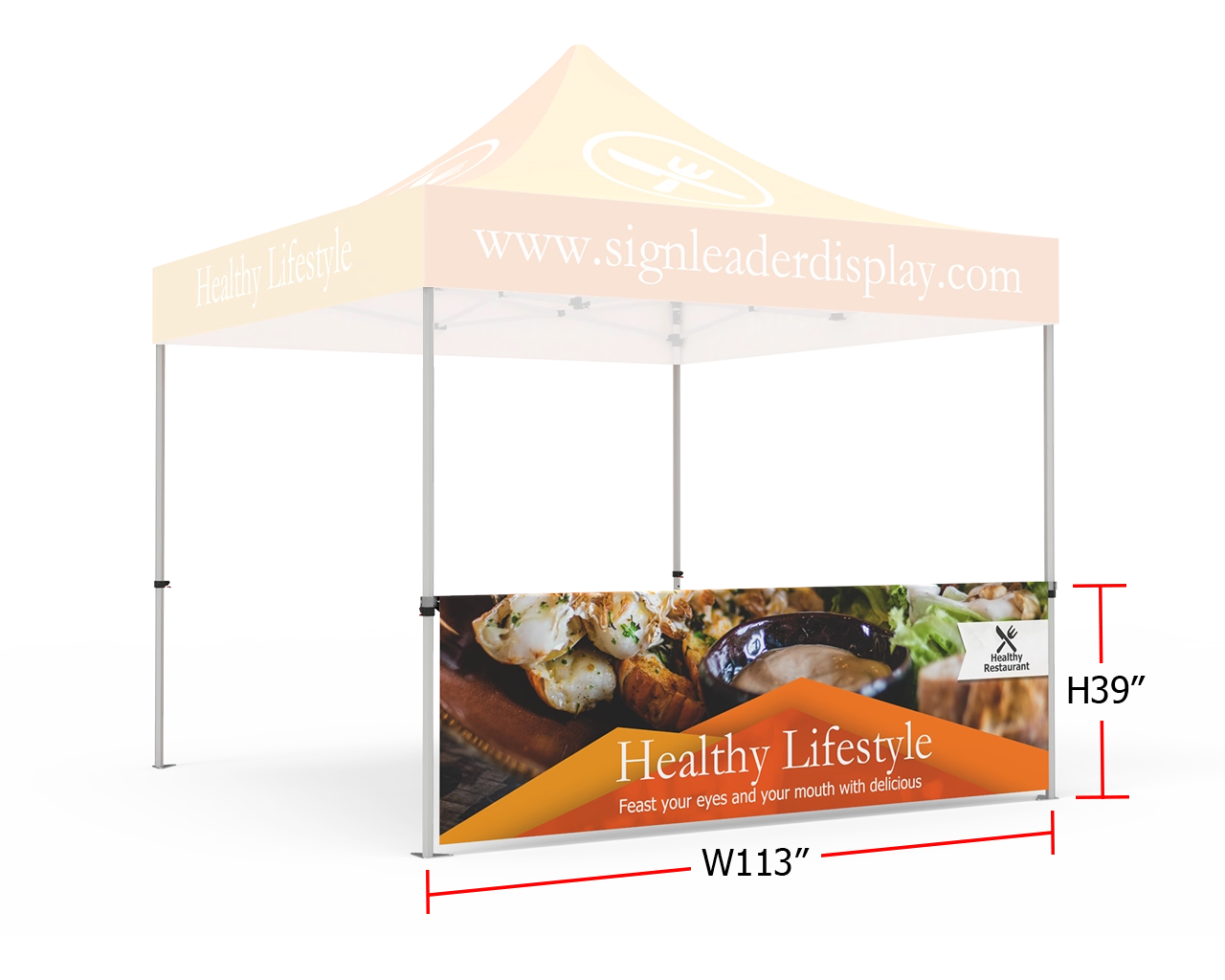 The 10x10 tent half wall is a multifunctional supplement to any pop-up event tent, and you can customize the printing. The half wall not only helps to enhance your brand image, but also closes the tent space while allowing air to circulate. Full color digital printing on 600 denier polyester fiber. Waterproof, UV-proof, weather resistance, scratch resistance. Free shipping, free design, fast turnaround, order now!